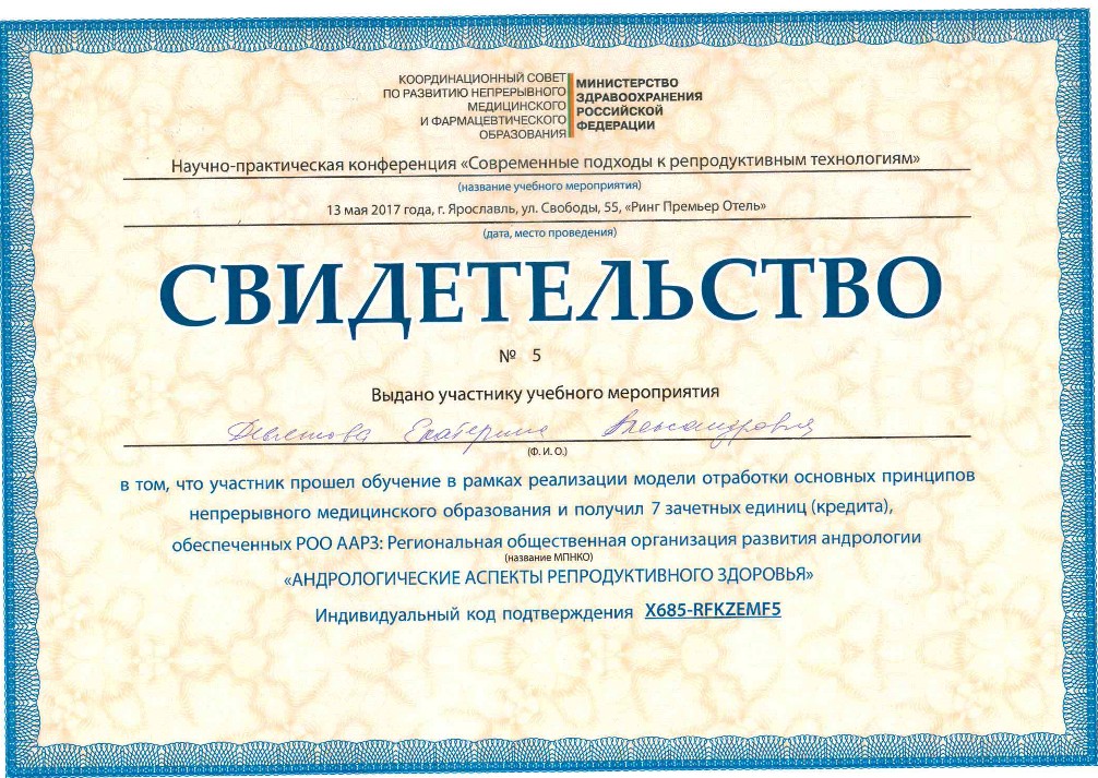 2020 г. – ГОУ ВПО «Российский университет дружбы народов», факультет повышения квалификации медицинских работников, «акушерство и гинекология».