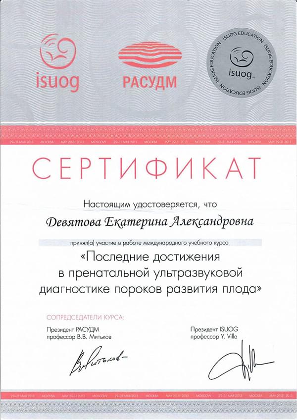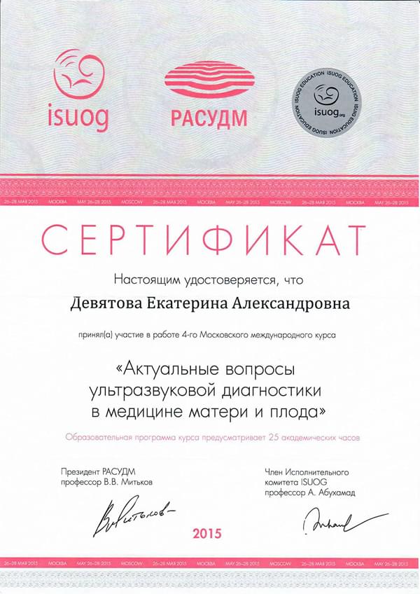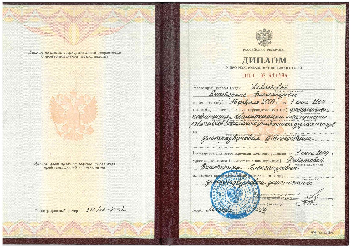 2009 г. – ГОУ ВПО «Российский университет дружбы народов», профессиональная переподготовка «ультразвуковая диагностика».
