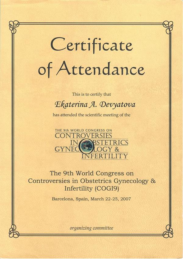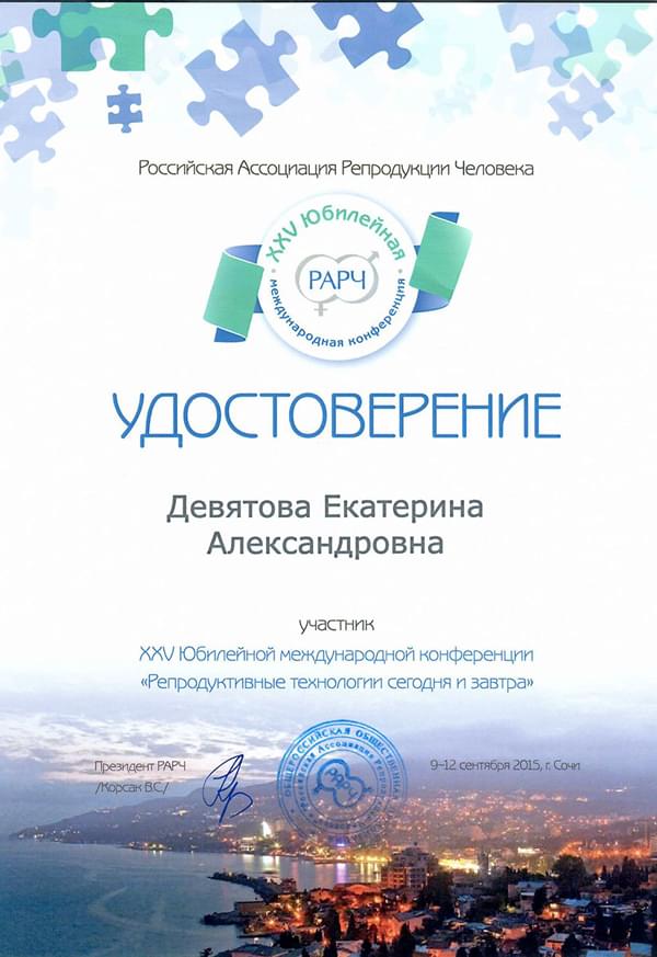 - членство в профессиональных ассоциациях: Российская ассоциация специалистов ультразвуковой диагностики в медицине (РАСУДМ), Российская ассоциация репродукции человека (РАРЧ), Междисциплинарная ассоциация специалистов репродуктивной медицины (МАРС), Российская ассоциация акушеров-гинекологов (РОАГ);