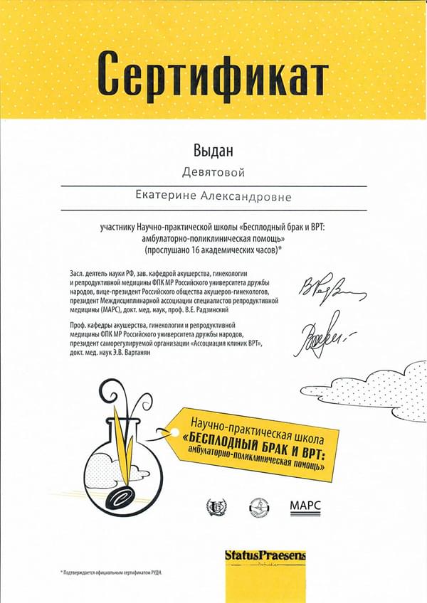 - Научно-практическая школа «Бесплодный брак и ВРТ: амбулаторно-поликлиническая помощь» под руководством проф. Э.В. Вартанян и проф. В.Е. Радзинского;